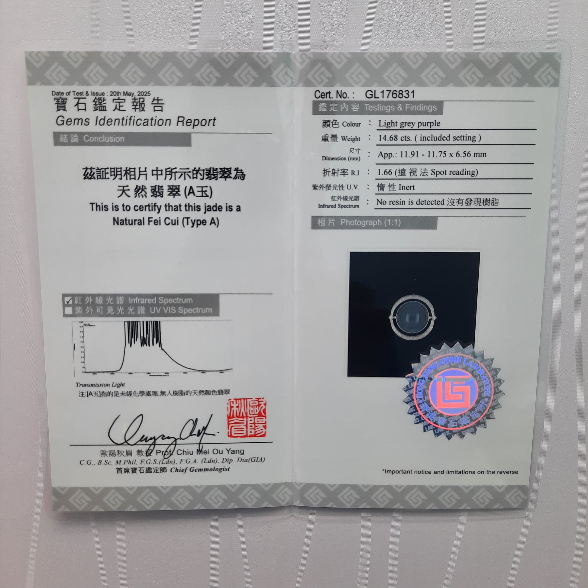 商品描述 :天然翡翠,18K白金和鑽石鑲嵌 ,紫羅蘭蛋面吊墜 (附有香港鑑定證書)